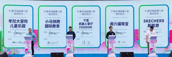 活动现场,51新天地购物中心总经理朱秋阳先生与5家品牌商家进行了现场签约仪式,分别是斯凯奇、小马快跑、千玺机器人餐厅foodom、考拉大冒险儿童乐园及周六福。